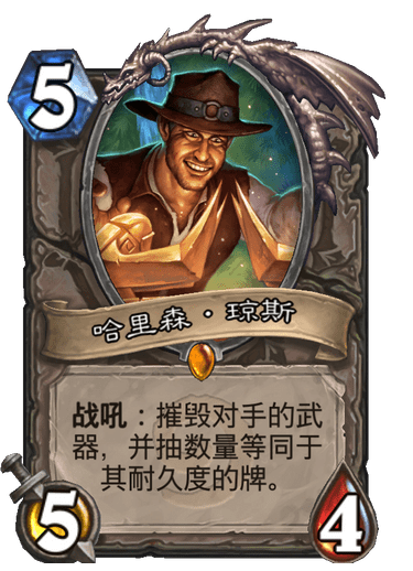 哈里森琼斯是这套宇宙牧的点睛之卡,对于当前环境到处存在的残片瞎、炸弹战(有时候圣骑士也会有武器),这张卡在牧师体系里发挥了重要作用,既有破坏武器效果,还能为牧师过牌,是一张要比黏指狗头人性价比高的卡,低费再配上一张小软,完美。
