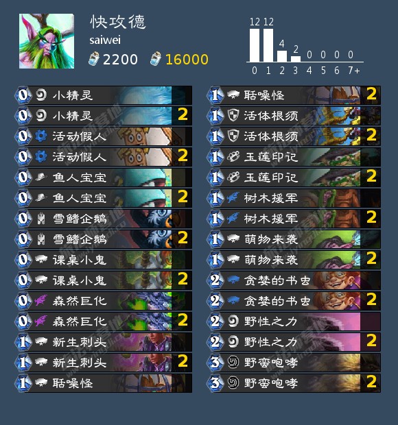 来自saiwei的一套快攻德,他用这套打上了传说,目前战绩是63局68%的胜率。这套卡组对刚入坑狂野的萌新十分友好,是真正的0橙卡组。卡组舍弃了海盗体系,牺牲了高上限来换取稳定性。卡组亮点是满编所有0费随从,这些随从可以完美与书虫、巨化以及各种群体buff形成联动,在游戏前期就早就一个强大的场面。