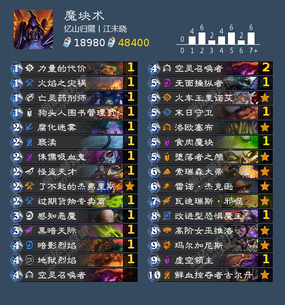 来自忆山归隰丨江未晓的一套半宇宙魔块术,他用这套以40场73%的胜率打上了传说,套牌中仅有空灵携带了两张,为的是来加快大恶魔的出场,不需要太多的过牌就能完成宇宙。对战快攻有亵渎黑暗天际等低费最强解,同时又携带了比较冷门的腐化迷雾和地狱烈焰,面对巨化德也能有一定的把握。面对慢速卡组则有火车王力代无面组成的高额爆发,暗影烈焰视个人喜好,可换成奇利亚斯。卡组中还携带了几个1、2血生物用来凑亵渎,总体比较流畅,但有时也会因为空灵不上手不能触发宇宙而败北。