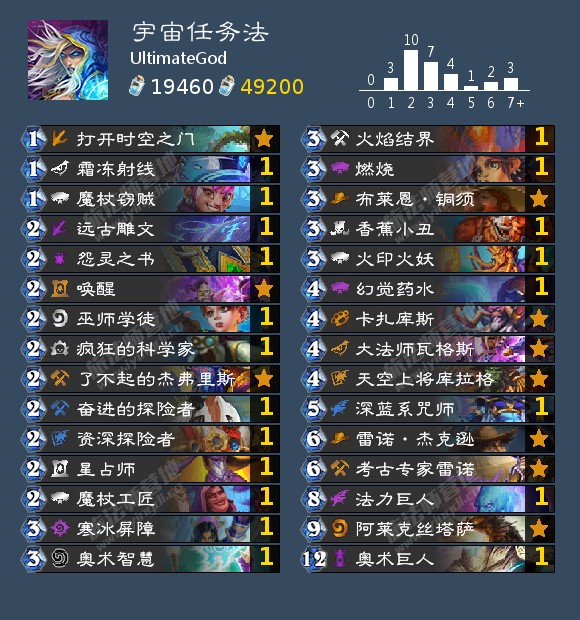 卡组最大的亮点是没带佐拉,而是选择了幻觉药水,仅比佐拉多了1费便可获得所有场上友方随从的1费1/1复制,而宇宙任务法的随从多为优质战吼,基本复制上哪个都是不亏的。宇宙任务法兼具宇宙法的抗快能力,以及开门法的对中后期卡组的终结能力,是套比较吃操作的上分卡组。