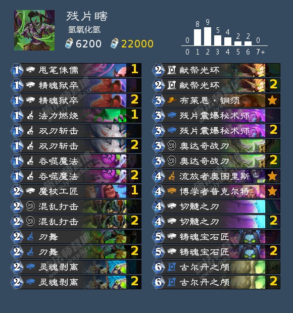 来自 氢氧化氢 的一套残片瞎,他用这套以42局69胜率打上了传说。由于现在模型膨胀得厉害,很多标准卡组加几张狂野卡,在狂野也有一战之力。古有jk战,今有残片瞎。虽然残片瞎是标准卡组,但是这个卡组的特性非常适合现在的环境。廉价的AOE使得我们面对铺场快攻大优。两把奥达奇战刃和残片体系也能让我们的血量保持健康。卡组里唯一加入的狂野卡是铜须,双倍战吼配合减费后的铸魂宝石匠带来了极高的爆发。