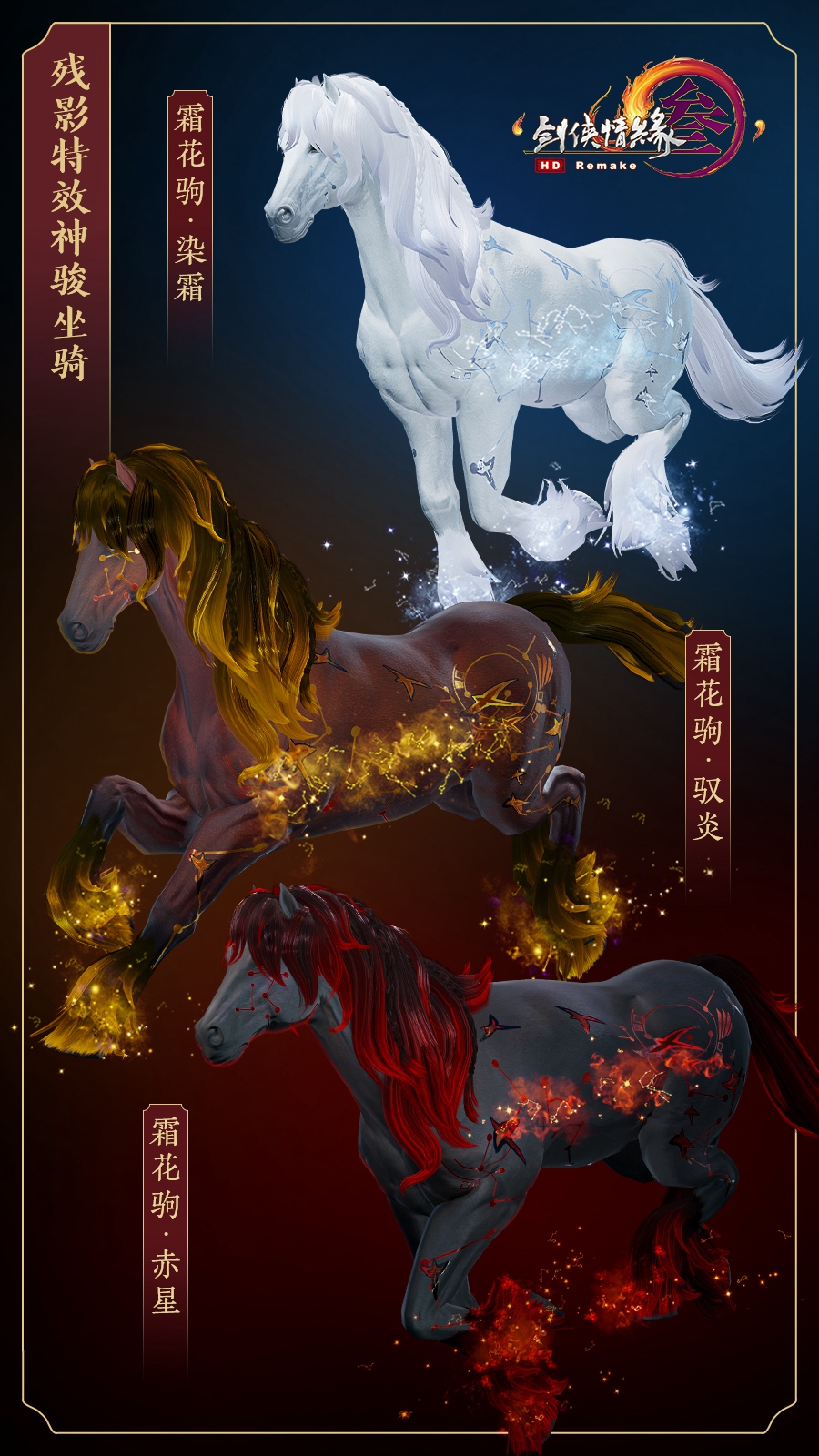全民欢庆双十一,《剑网3》双十一大惠战11月5日即将盛大开启,本次“618”年中大促还将隆重推出三匹特效炫目的神骏“霜花驹·染霜”、“霜花驹·赤星”、“霜花驹·驭炎”,全新残影特效坐骑“骁将”为你带来骑乘酷炫震撼体验,那么,全新残影神骏坐骑怎么样?相信一定会有很多侠士还不是很清楚,那么接下来,就让我们一起来看一下《剑网3》中全新残影神骏坐骑一览吧。