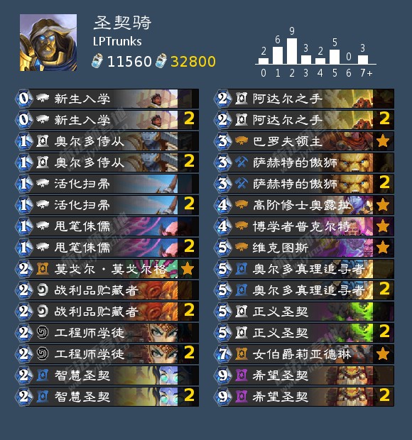 在对比赛卡组以及天梯高玩卡组整合并辅以实测后,附上了LPTrunks在巡回赛中的构筑,放弃了炎术士和虔诚的信徒这一类无buff就容易卡手的牌,携带了博学者普克尔特和维克图斯来保证过牌和抽卡质量(卡组中除了巴罗夫,其余亡语怪都很有用,并且新生入学中可能有紫罗兰魔翼鸦等优质亡语怪)。卡组手感十分顺滑,过牌充足,预测维克图斯将成为圣契骑一个新的常驻卡位。