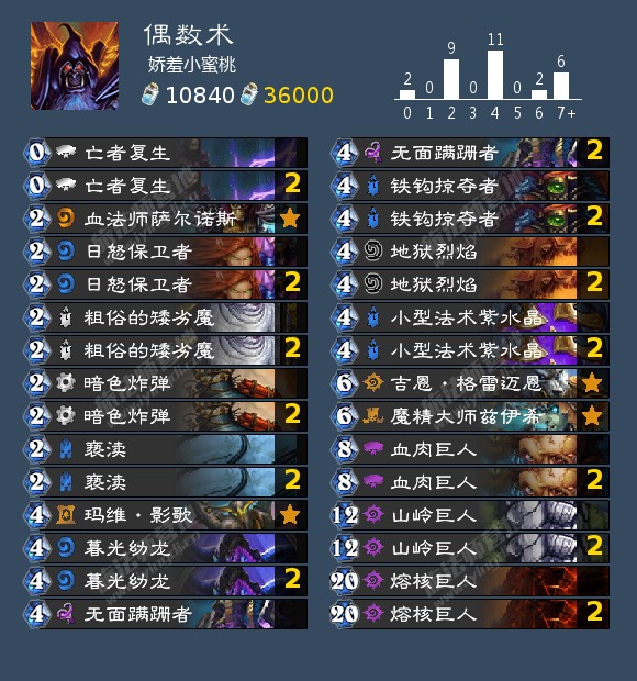 来自 娇羞小蜜桃 的一套偶数术,他用这套以82%的胜率打上了传说。黑眼术自残下巨人的思路同样适用于偶数术。构筑上这套中规中矩,带上了六巨人,亡者复生也能复活巨人。对局上对战德、贼、骑、萨默认快攻,留解牌,在安全血量尽量操作找机会返场;对慢速找山岭巨人和血肉巨人抢血,但不要一波交太多资源,做到巨人源源不断,伺机斩杀。打术士要留玛维,法师默认奥秘法,留紫水晶。这套卡组主要针对快攻,解牌可以贪,但要预判对面是否会加buff。