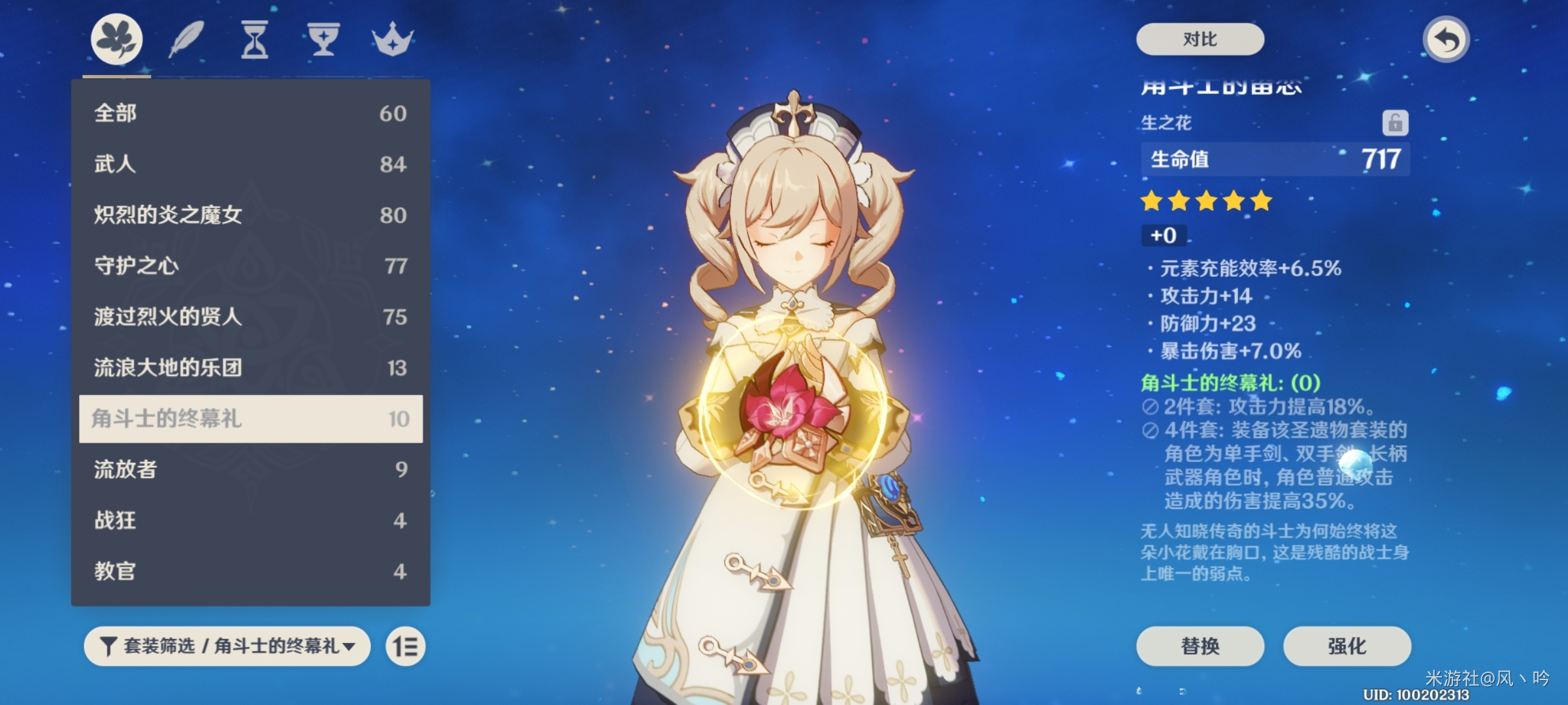 原神迪卢克主C套装推荐的是冒险等级45级以前用角斗士4件套,因为4件套对大剑(双手剑)有伤害加成,2件套是攻击加成,而且比较好获得,前期可以通过刷风龙废墟,风魔狼(一周一次)有几率掉落获得,冒险等级45级以后用魔女4件套。