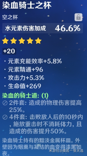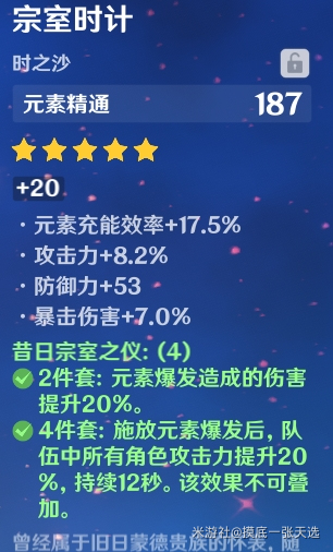 花和羽毛是固定的,不说了,杯子主属性选水杯,时之砂选元素精通,理之冠最优选暴击。