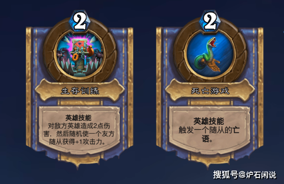 猎人的初始英雄技能是生存训练,是正常猎人的英雄技能外加随机buff随从1攻的效果。另一个英雄技能是触发应随从的亡语。目前能用的英雄技能已经注定了猎人的对决模式思路——铺场抢脸打法。