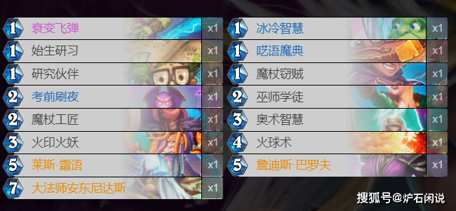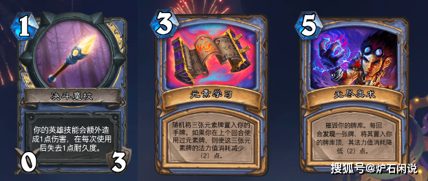 法师的3张宝藏卡牌是103的武器决斗法杖、3费的元素学习法术和5费的无尽奥术法术卡牌。其中决斗法杖是增强了法师的英雄技能,而元素学习是元素法的宝藏卡,无尽奥术则给了法师“无限续航”的资格,是打后期的优质卡牌。