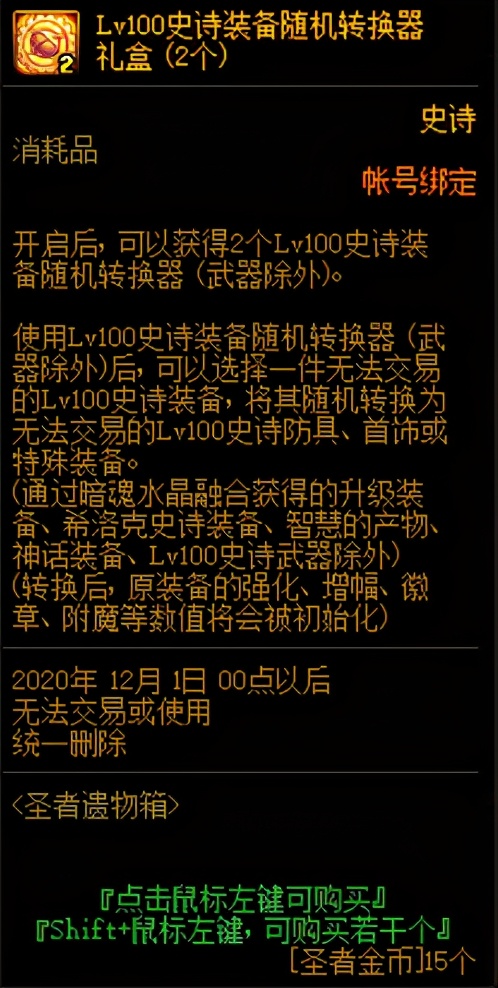 DNFLv100史诗装备随机转换器礼盒获得方法15个圣者金币可以在赛丽亚商店兑换一个史诗装备随机转化器,可以把一件垃圾的史诗随机装换成一件100级史诗,当然除了工作服、武器和希洛克装备。