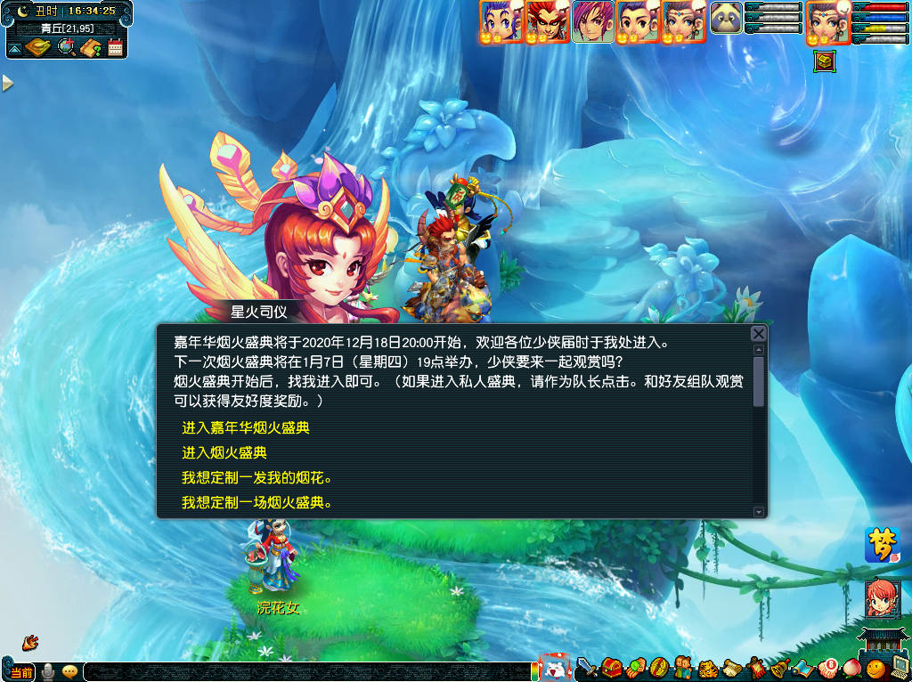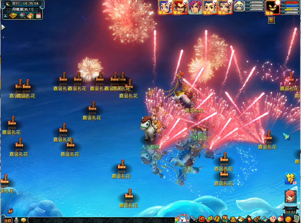 此次烟火盛典持续30分钟,并于20:00:00和20:15:00两个时间点投放嘉诞礼花,拾取可以获得烟花和奖励。