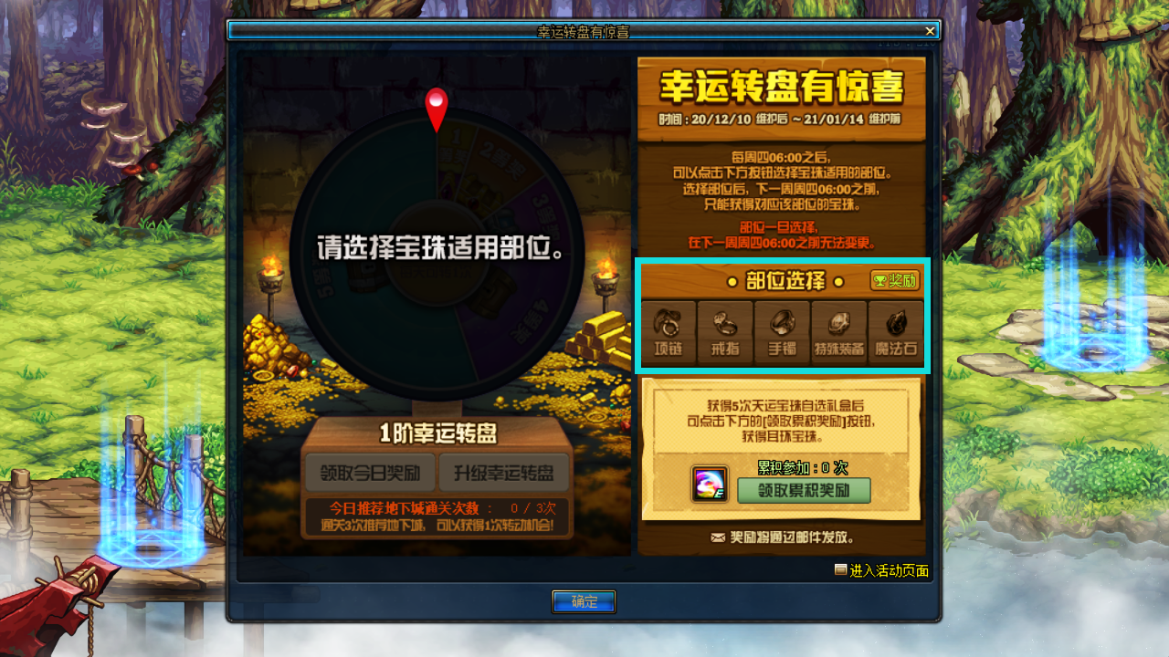 DNF2020幸运转盘有惊喜活动玩法第一步要先选择奖励类型,在活动界面中有【部位选择】,也就说我们要先选择右边的5个部位附魔宝珠中的一个部位类型,然后再进行转盘抽奖,每一个部位都有1-5等奖,我们只有拿到五个部位的一等奖,才能领取到终极奖励。