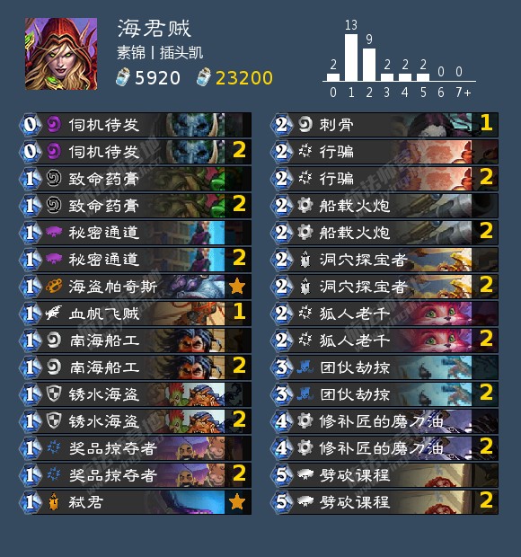 在构筑上,232的狐人老千很多时候可以完美地替代之前的空降歹徒。因为狐人可以触发连击,比如刀油,劫掠,行骗以及刺骨。行骗替换了之前版本的书虫,因为书虫需要打空手牌才能稳定过牌,对于随从质量本来就很低的海军贼来说,无疑是雪上加霜。和新版本之前的海军贼相对比,这套牌放弃了满编直伤,仅仅留一张刺骨,取而代之的是新卡奖品掠夺者。奖品掠夺者配合原有火炮海盗体系可以完美处理小随从,保留场面并且处理一些小的嘲讽,这样使得刀打脸的效率更高,从而达到和满编直伤差不多的效果。至于现在流行的大范,作者认为大范是场面卡,和注重直伤的海军贼搭配的话,并没有什么特殊的效果,而且由于海军贼随从质量太低,做范又要大量的小随从,一旦大范被解很容易断掉节奏。