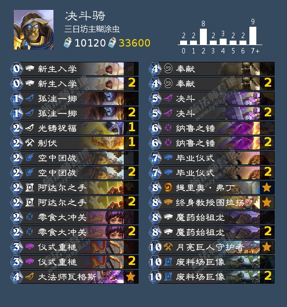 这套牌的思路很简单,前期利用阿达尔之手以及新生入学、空中团战等小法术过牌+混过前期,然后利用决斗和毕业仪式来让大哥提前登场终结比赛。仪式重槌可以在释放完小法术后挂,下回合直接接奉献或决斗来返场。这套牌里的大哥功能可谓是一应俱全,有能百分百单杀对面的图拉扬,套娃的魔药始祖龙和月亮巨人,以及叹息之墙废料巨像等。三日坊主糊涂虫认为这套牌在现在的环境中表现相当不错,可以较好的针对DH同时可以考虑携带冒险号角来稳定过到大法师瓦格斯。