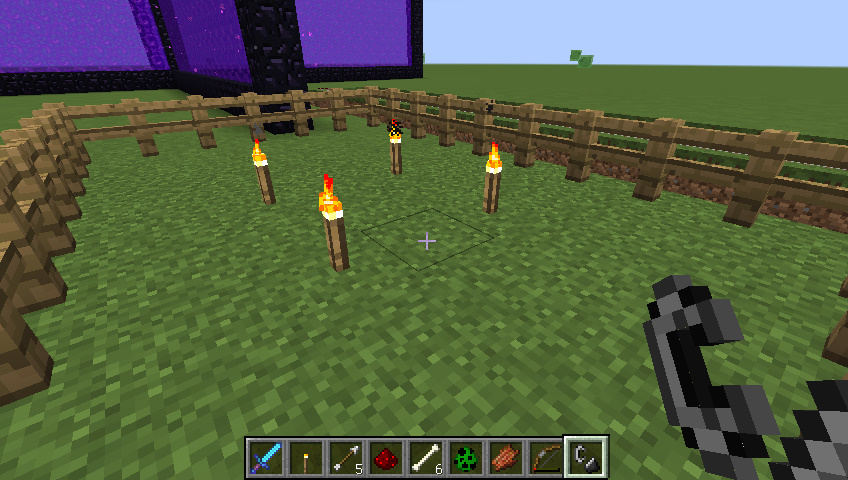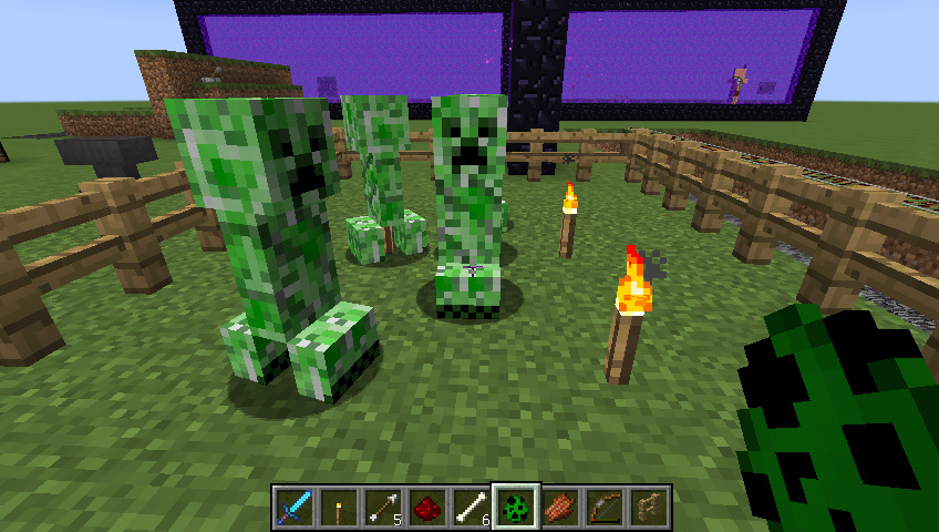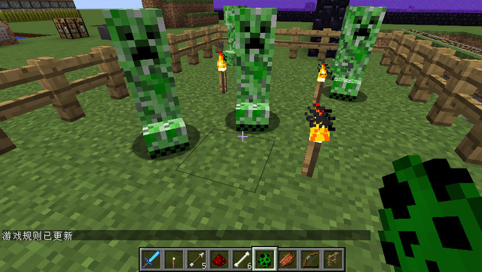 2、然后我们来简单做一个测试,当然这也是这段代码的用法。小编我首先召唤几只苦力怕,来当做这个爆破工具。多整几只,插上防爆能力极低的火把。然后,我们就可以来感受一下了。