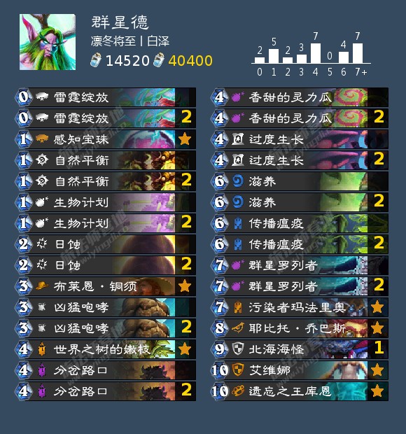 炉石传说2021群星德卡组玩法攻略是无论打什么起手尽量留生物计划,日蚀和灵力瓜。对阵快攻起手留传播瘟疫,凶猛咆哮和分叉路口。打慢速起手尽量留过度生长或者滋养这一类的跳费牌。开瓜的时候没有抽到王库恩,则需要等另一个瓜或者王库恩来保证七血随处的数量,乔巴斯的定向检索可以使我们开瓜开到王库恩的时候直接抽艾薇娜和铜须或另一个群星罗列者。