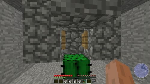 1、准备材料:4桶水,一块沙子,一颗仙人掌,10块圆石,和两个棚栏门。