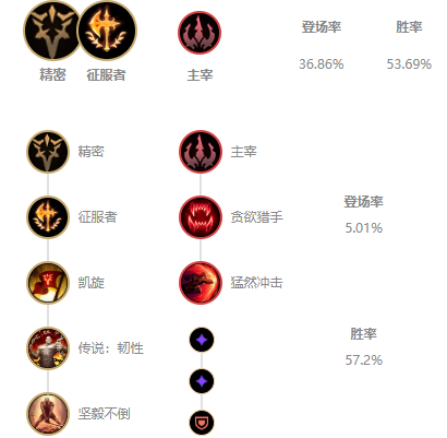 征服者是红凯的标配,触发后提升适应力,叠满后可将部分伤害转化为治疗,持续作战能力再次得到提升,凯旋参与击杀得到生命恢复,提高生存几率,传说来增加韧性更好的对抗控制,坚毅不倒在生命值低于60%时可对敌人多造成伤害。贪欲猎手可获得生命偷取效果,猛然冲击更好的搭配Q技能来打输出。