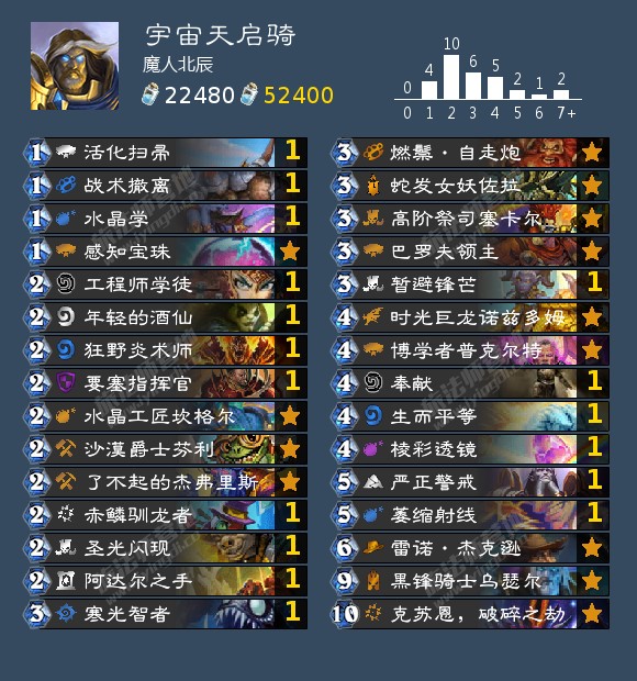 构筑上新克苏恩的加入使宇宙天启骑有了除天启外的另一个赢点,四张碎片的加入也很好弥补了骑士的aoe,直伤与单解。赤鳞训龙者可以稳定过到时光巨龙,让打快攻的胜率更上一层楼,博学者可以稳定让我们过到dk,雷诺,克苏恩的四张碎片,战术撤离是一张十分灵活的单卡,可以宇宙单卡加撤离让快攻防不胜防,也可以在使用克苏恩前一回合挂上保证自己场上没有怪来两个克苏恩斩杀对手,也能回手dk的天启骑士。