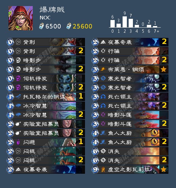 炉石传说2021爆牌贼狂野卡组玩法攻略是前期找鱼,等待爆牌时机和斩杀为一套流程。利用闪避,闷棍,消失配合伺机待发灵活爆牌,在手里有dk和一张招募员保证无限的情况下可以无视自己的牌库直接爆牌,暗影步可以回收一费爆牌鱼配合铜须。利用冰冷智慧,背刺以及死亡领主度过前期,当对手没有随从时要留一张背刺解自己的鱼人大厨过上爆牌鱼。