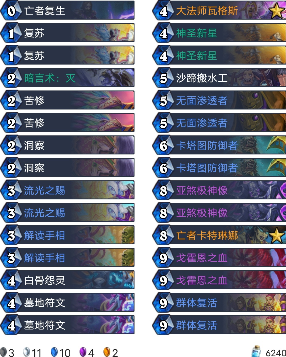 标准复活牧肯定没法跟狂野比,不过我们带了一定量的4、5费随从,一般来说我们能顺利地贴上墓地符文,场面还是能扳回来的,腐蚀后的洞察,可以让我们的高费随从提前上场;流光之赐可以扩大的我们的场面,同时增强随从的交换能力;标准没有暗影精华,亚煞极神像勉强替代一下;戈霍恩之血仍然是非常重要的资源牌,毕竟我们只有两张群体复活。
