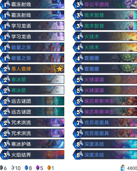 起手可以留牌:学习龙语、能量之泉、咒术洪流、远古谜团、愚人套牌;说法术法目前是娱乐卡组主要是因为不适合目前的环境,很容易被抢死苟不住。法术法凭借着资源和伤害还是勉强能打一些慢速控制卡组的;我们也可以携带虚空之风传送门、燃烧等单卡;目前环境瞎子太多,深度冻结比创世之力更适合环境一些。