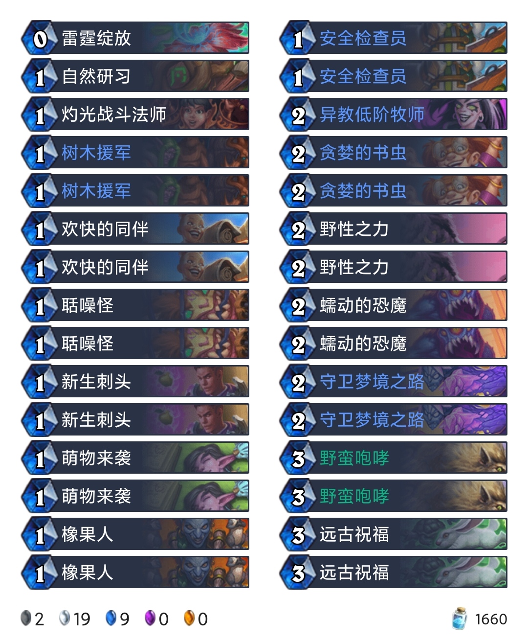 1张雷霆绽放可以让我们前期铺出更大的场面,缺点是抽一打一容易鬼抽,所以只带了1张。1张自然研习主要是前期配合聒噪怪来铺场,同时可以根据对局走向寻找合适的法术。异教低阶牧师作为低配版的洛欧赛布可以卡住对面的解场法术,有利于我方随从的存活。蠕动的恐魔相对于5费的菌菇术士,更加低费高效,无论是BUFF随从打伤害,还是BUFF随从交换都非常实用。