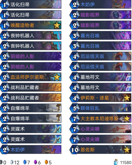 整体上偏娱乐,也能勉强上分,对局时间较长。活化扫帚、自爆绵羊可以帮助我们应对快攻,我们亡语很多,任务可以很快的做完,后期“希望守护者阿玛拉+灵媒术”具有极强的生命力;碰到慢速卡组我们可以考虑直接留一张厄运信天翁,阴暗的人影、墓地符文都尽量跟厄运信天翁配合;“伊莉斯·逐星”是我们后期的关键,黄金猿尽量等我们大主教本尼迪塔斯抄完之后在用,总体上这套卡组“搞人心态”是有一手的,玩家也可以带上“鼬鼠挖掘工”。