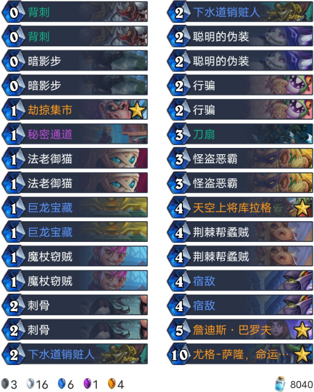 来自标准的一套任务贼,做完任务后,2费的“幻象之刃”还是不错的,解场打脸都适用;卡组的衍生单卡很多,对局变化莫测,娱乐性十足,最后还有“尤格-萨隆,命运主宰”,见证奇迹的时刻到了。