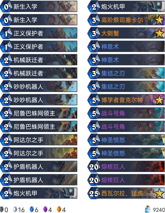 天胡起手:高阶祭司塞卡尔+2个熔核巨人。一般留牌思路:新生入学、机械跃迁者、尼鲁巴蛛网领主,在保证前期节奏的时候,可以留战斗号角,遇到慢速必留神恩术。我们卡组的优势在于前期费用曲线很流畅,卡牌之间的联动性较强,过牌充足,一般不会出现断点的情况;前期按照快攻来打,中期过牌缩减牌库,后期通过神圣愤怒结束比赛。遇到快攻,我们有正义保护者、吵吵机器人可以很好地阻挡它的攻击频率,为我们的反击赢得时间;