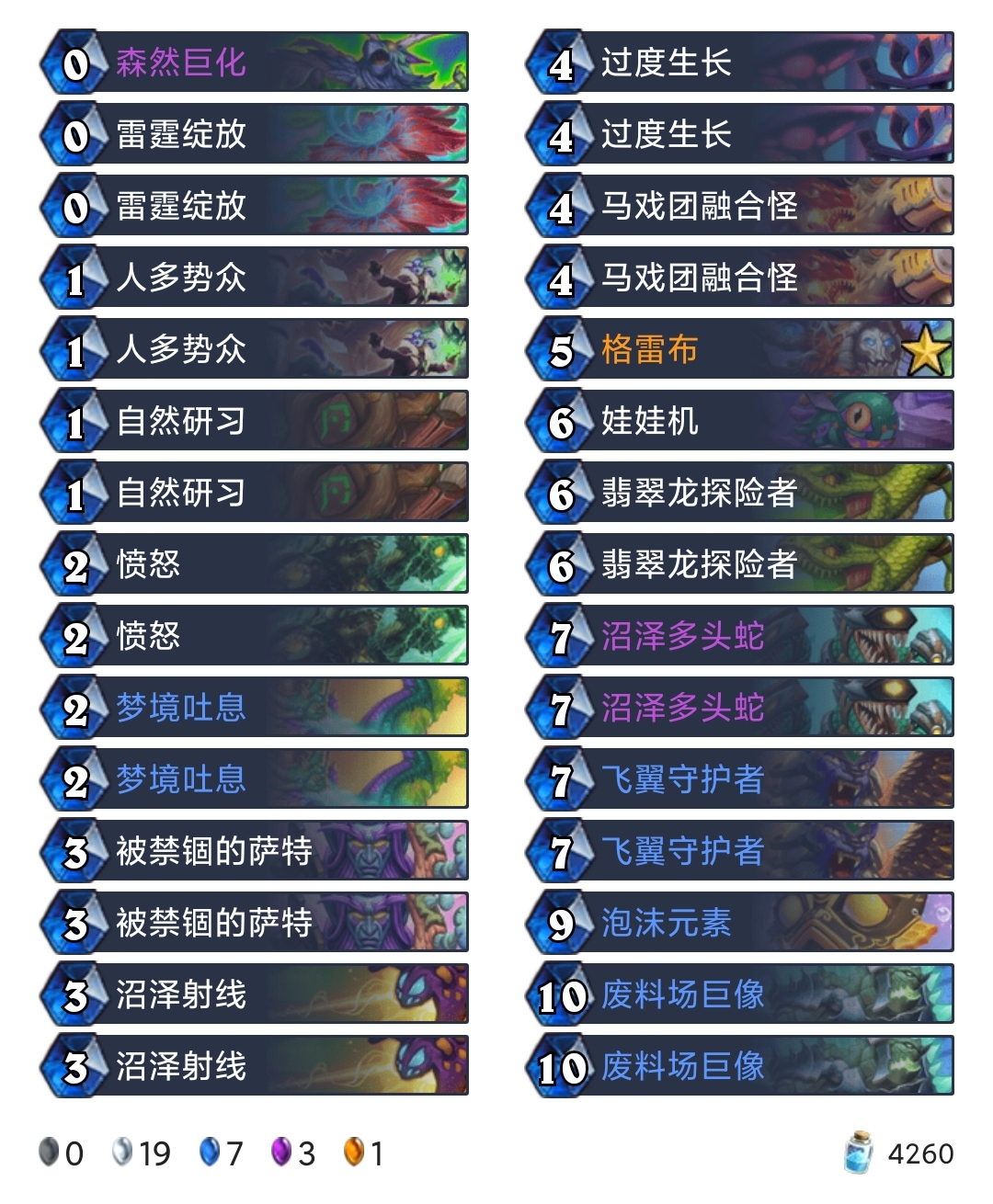 起手留牌:人多势众、被禁锢的萨特、过度生长、雷霆绽放,卡组总体上很笨重,过牌能力差,不像狂野有星界沟通。一张森然巨化只是为了能够提高我们拉出来随从的身材,我们携带的随从大多以嘲讽、突袭为主,注重护脸与后期的随从交换能力。不过卡组笔者自己也觉得弱,分享出来,也只是提供一下思路,不见得都那么功利的上分,如果大家有好的大哥德构筑,欢迎一起交流,来研讨一下大哥德到底能玩与否!