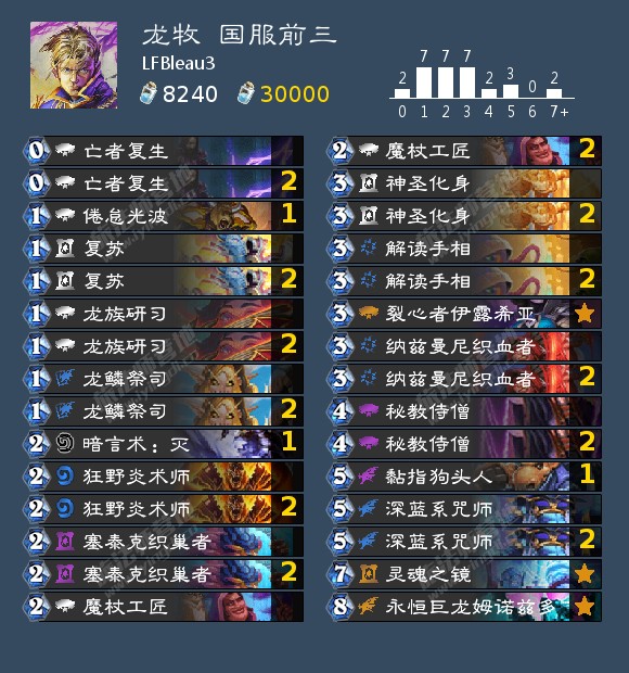 牧师仍然是在天梯高分段活跃的一个职业,但与往常相比最大的不同就是又重新回到4+1(秘教侍僧+倦怠光波)的龙牧,由于瞎少了,4+1会在很多对局上抓到一些buff后的随从,从而放弃了或是缩减了洞察的过牌,而魔杖工匠和深蓝系咒师还有亡者复生为牧师提供了更多的资源续航。塞泰克织巢者+纳兹曼尼织血者双核站场刷牌成为了龙牧一个重要的反击节奏点(而且刷起来很爽的~)。总之牧师还是需要吃熟练度的,可以多练练多理解理解。