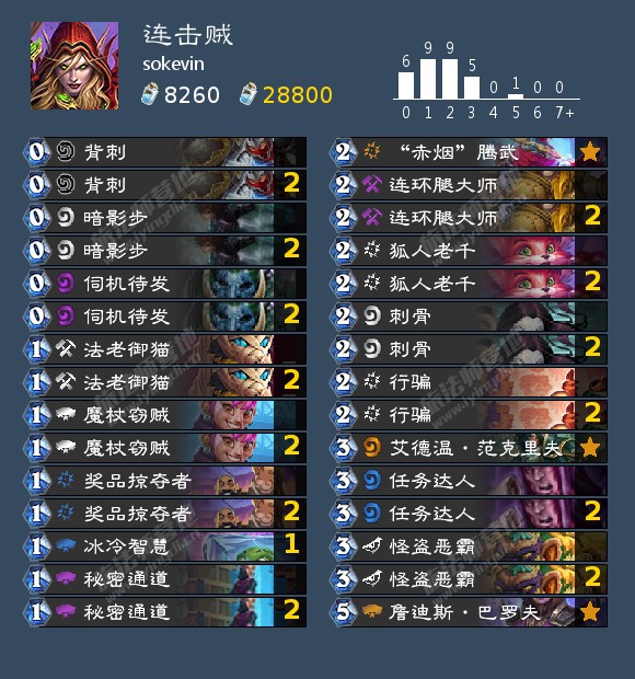 补丁后连击贼开始在外服大火,并有多个版本的构筑。卡组调整主要集中于冰冷智慧、奖品掠夺者和赤烟滕武这几张卡位,替换卡则有军情七处特工、冷血、迪菲亚头目等。替换卡也基本为连击卡牌,以保证连环腿大师的刷牌能力。大家在使用中也可以根据环境进行调整。赤烟滕武并非必备卡,换成冰冷智慧或者军情七处特工皆可。