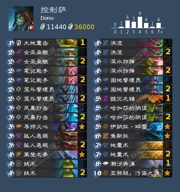 这套卡组的总体思路即为解光对手的资源,如果还不能取胜,就通过积少成多的伤害将对手打死。大地震击和妖术能有效处理目前环境中数量极多的盗贼的艾德温范克里夫和任务达人,以及骑士的各类buff。洪流、风暴打击、深水炸弹、哈加沙的阴谋、鱼斯拉和地震术则能够处理进化萨一波又一波的场面。一旦血线告急,女巫杂酿和潮汐奔涌经常能让快攻对手绝望。为发挥笼斗管理员的过牌能力,Dono选择带了两把刀。毁灭之锤配合风暴打击对没有回复能力的对手还是非常好用的。这套卡组解场能力和回血能力极强,但是笔者认为这套卡组能够上分与卡组信息差关系很大。总体而言,这仍然是补丁后的一个新思路,也希望大家多多尝试并对卡组做出更多优化。