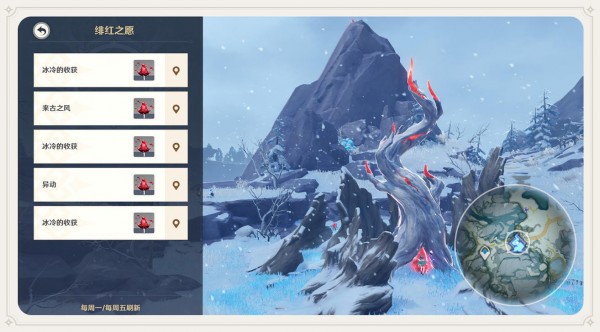 雪山区域可探索的绯红玉髓数量有限,旅行者需完成绯红之愿任务,继续积攒绯红玉髓升级忍冬之树