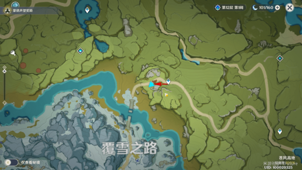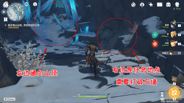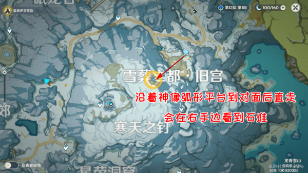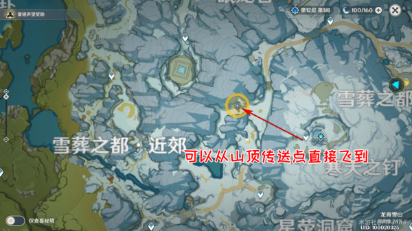 循着小地图的指引,我们来到雪山西面的山坡,前进路线如图所示,可以直接从雪山山顶的传送点飞到(尚未解锁山顶的小伙伴可以从其他位置绕路过来,追踪任务有明显的黄色光柱提示)。