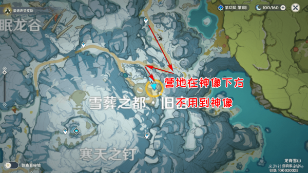 根据乔尔给出的信息,我们首先来到覆雪之路,前进路线如图所示(已经解锁了七天神像的旅行者可以直接传送到七天神像往下飞,营地就在神像下方,追踪目标会有很明显的黄色光柱,非常好找)。