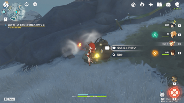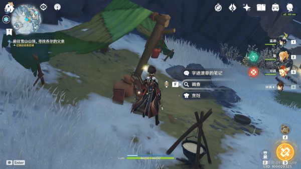 在到达任务区域后,我们可以看到雪堆下隐约露出堆积着的行李,通过火元素攻击融化掉雪堆后(普通雪堆,不需要深赤之石buff),同样是一本字迹端正的笔记。这里就是乔尔父亲探索过程中支起的第二处营地了,同时我们还可以了解到,他打算要冲击山顶,于是我们又在应急食品的建议下,继续前往山顶寻找线索。
