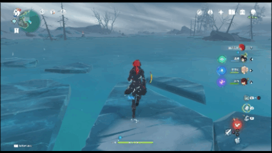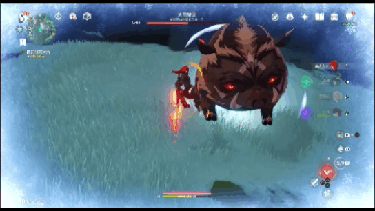 在把场地上的野猪都打倒后大雪猪王会出现并触发战斗,这场战斗格外需要注意的是避开雪猪王的正面以及战斗的持续时间,雪猪王的大部分攻击都是对前方发动,如果处于侧面以及后面就很少会被击中。这个位置缺少火源,无法及时削减寒冷条,寒冷积蓄满后会持续造成伤害,建议带上可以回复生命的角色。