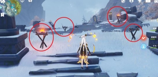 七天神像前面那个圈圈有三根柱子,上面有个机关,全部启动之后会有三个宝箱。有一说一,我发现米哈游真的好喜欢机关啊,在原神游戏中我碰到了好几次机关了。