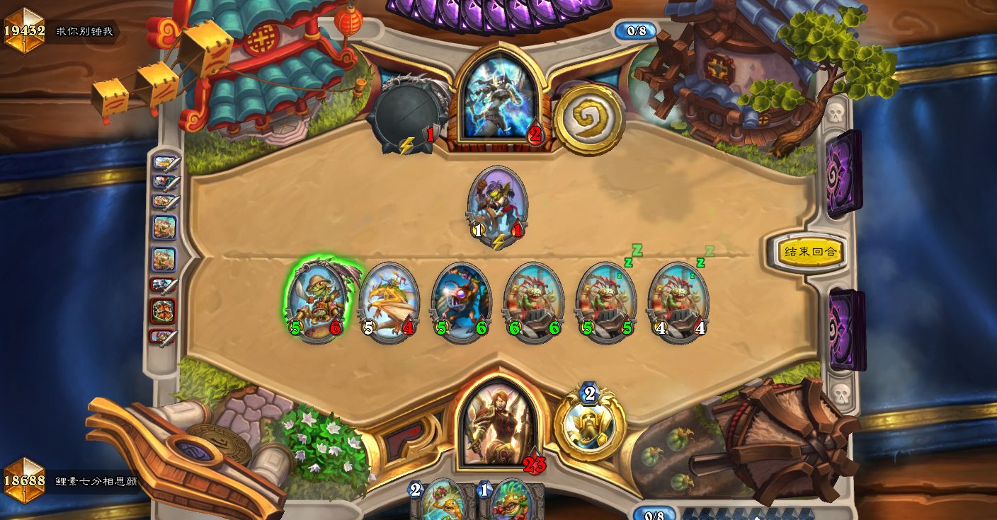 战士也属于优势对局,战士看似不怎么好打,但是实战还可以,我们打战士防的只有两种解场卡,一个是剑刃风暴,这个只要随从血量不是一样的就可以,上个1血小杂鱼,以免被对面直接解光,第二个就是防止乱斗了,有古神在上的话,在对面要放乱斗的前一刻放个古神在上(基本上5费我们场面高的话,就要防乱斗了),至于对面的疯狂叠甲,别看叠甲很快,但是很难叠甲的同时解掉我们的场面,所以我们就把该解的都解掉掉(铸甲师),剩下抢脸就好。