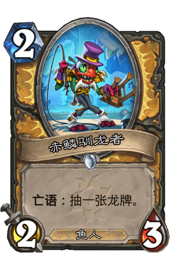 赤鳞是暗月马戏团的一张卡牌,2费2/3的身材在鱼人的体系里面, 其实也就是一个中等的身材,但是他的亡语却可以定向的过龙牌,而我们的牌库只有一种龙牌,那就是鳞甲领主,这套卡组本身的过牌卡就不多,更别说定向过牌了,所以这张卡牌在我们这套卡组还是很重要的。