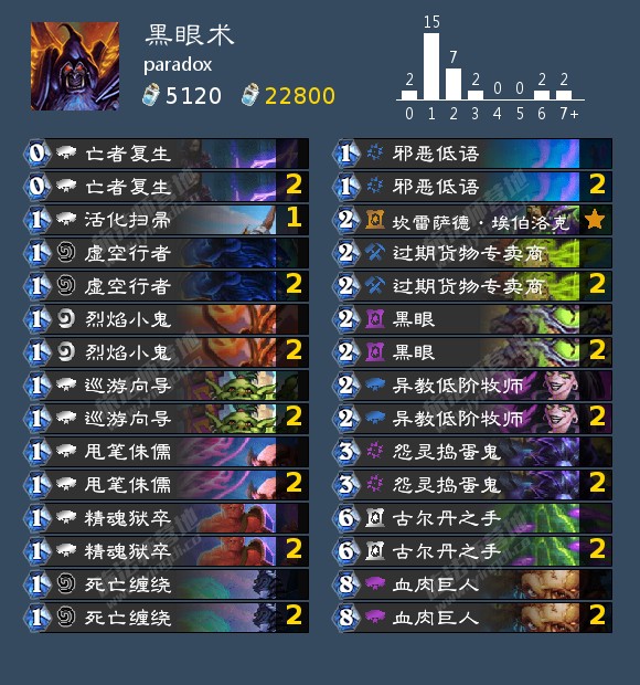 黑眼术的打法就是利用黑眼和坎雷萨德·埃伯洛克的费用作弊机制,以及减费的血肉巨人,在前期铺出高质量场面取胜。异教低阶牧师和新卡怨灵捣蛋鬼都属于功能牌,在占据场面优势后,他们的锁费效果能有效卡住对手的操作空间。甩笔侏儒是这套牌比较有争议的一个点,他的作用主要是戳自己,这样可以提早出血肉巨人的回合,但是这套牌的法术并不多,所以到底有没有用还请评论区大佬们教教。