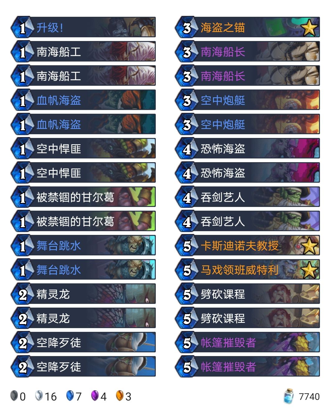 分别由harash打到传说88名,cantelope打到传说69名的海盗战,卡组整体费用偏低,并且海盗之锚配合提高耐久的卡牌可以源源不断的过海盗随从,帐篷摧毁者最低只需要2费,并且可以被舞台跳水定向检索。整个卡组玩起来比较流畅,在恶魔猎手被削弱之后是快攻玩家的另一个好选择。