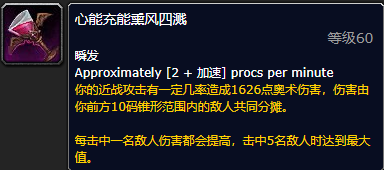 装备效果: 你的近战攻击有一定几率造成859点奥术伤害,伤害由你前方10码锥形范围内的敌人共同分摊。