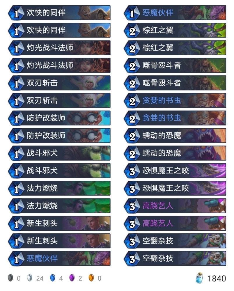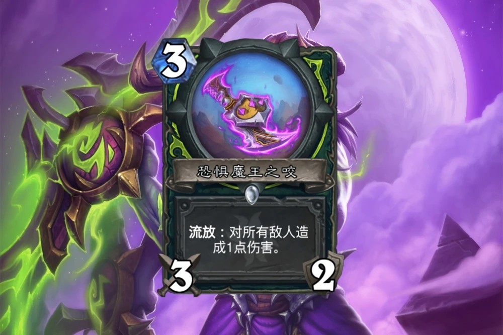 蠕动的恐魔已经写过很多次了,它是一张非常超模的buff牌,不管你是提高场攻打伤害,进行有效交换还是防AOE,都很好用。恐惧魔王之咬已经取代了奥达奇战刃,成为快攻玩法的标配。用可有可无的吸血,换来了1点攻击力和一个流放效果:对所有敌人造成1点伤害。伤害能力大大提高的同时,还为恶魔猎手提供了一个小型AOE,不管是快攻内战还是补刀都很不错。
