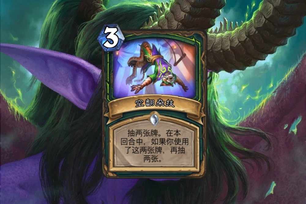 空翻杂技是恶魔猎手版本的奥术智慧,强大之处在于如果当回合使用抽到的牌,还可以额外抽取两张。你要知道快攻恶魔猎手平均对局回合数只有6个回合,古尔丹之颅并不适合这种玩法,仅靠书虫和幽灵视觉又不够稳定。正是有了空翻杂技这张稳定高效的过牌法术,恶魔猎手的进攻速度才会有了质的飞跃。