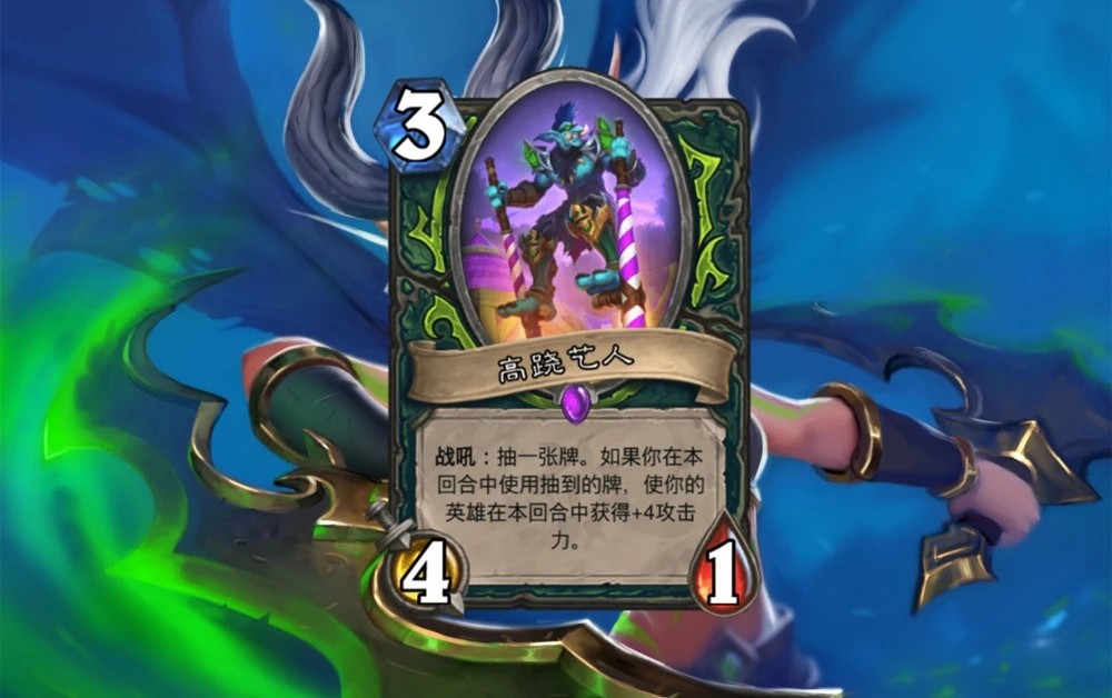 如果说空翻杂技是恶魔猎手提速的基础,高跷艺人则起到了一锤定音的作用。它不仅有过牌的效果,还可以获得额外的攻击力。卡组内最高费用的卡牌也不过是3费而已,6费打出高跷艺人就一定会获得4点攻击力。比较极端的情况下,7费高跷艺人抽到高跷艺人,再抽到双刃斩击,就能瞬间获得10点攻击力。