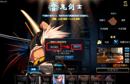 DNF创建PK专用角色步骤五:点击“创建角色”按钮后,打开昵称输入窗口。在窗口文本框中输入角色名,然后点击“重复”按钮。