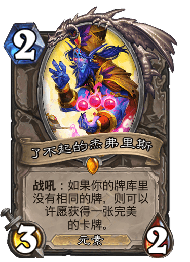 一般来说过牌相对来说比较快的职业都很喜欢外挂一张了不起的杰弗里斯,例如狂野弃牌术、标准OTK吸血瞎,当然标准防战也有携带的。我自己个人习惯是不喜欢带,大部分对局都是当做血沼迅猛龙来使用,与其追求上限,不如踏实稳定来的实在,炉石一直不属于完全意义上的电子竞技游戏,主要问题是出在随机性太强的问题,也就是咱们在游戏里面平常所“嗤之以鼻”的运气,可作为单纯的游戏而言,这难道不就是乐趣所在,谁没神抽过,三十年河东,三十年河西,风水轮流转而已。