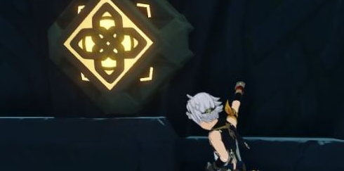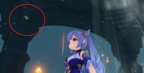其次朋友站在7天神像这里看,就能看到红圈位置的开关,这是因为这里击碎坚冰才能开到开关,打开开关后,在烂尾楼中心这里就会出现一个风场。